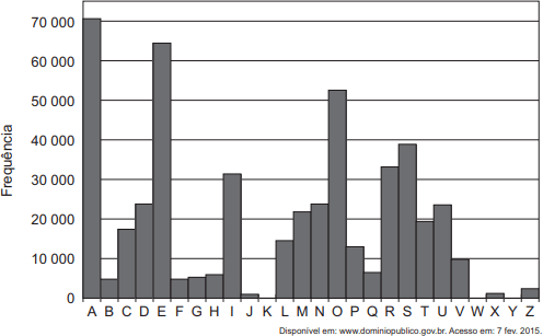 Uma análise do texto do romance O guarani, de José de Alencar, que é composto por 491 631 letras, gerou o seguinte gráfico de frequências:
