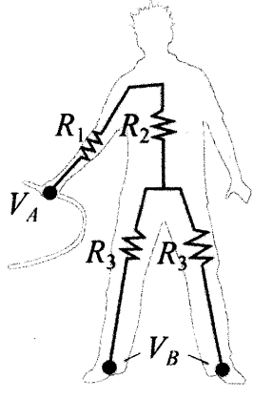 A corrente elétrica envolvida em um choque elétrico é determinada pela voltagem e a resistência do circuito. O corpo humano tem uma alta resistência inerente à corrente elétrica, o que significa que, sem tensão suficiente, uma quantidade perigosa de corrente não pode fluir pelo corpo e causar ferimentos ou morte. Considere a figura abaixo onde uma pessoa molhada segura um fio com uma das mãos e está sobre uma plataforma de metal.