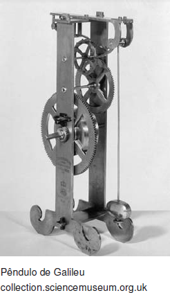 A figura a seguir mostra a estrutura de um Relógio de Pêndulo exposto no Museu de Ciências britânico. Planejado por Galileo Galilei, seu princípio de funcionamento é baseado na regularidade da oscilação (isocronismo) de um pêndulo.