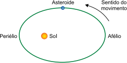 A figura mostra a trajetória elíptica do movimento de translação de um asteroide ao redor do Sol, localizado em um dos focos dessa elipse.