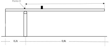 A barra permanece em equilíbrio devido à ação da força peso, da tensão aplicada pela corda presa à sua extremidade esquerda e do peso da massa M = 20 kg. A posição da massa M pode variar de O até a extremidade direita da barra. Essa variação da posição de M é compensada pela variação da tensão no cabo, de modo que a barra permaneça em equilíbrio estático e paralelamente à superfície horizontal. Despreze todos os possíveis atritos do sistema, considere a aceleração local da gravidade g = 10 m/s2. A distância da extremidade esquerda da barra ao ponto articulado é de 20% do comprimento da barra. Devido à variação na posição da massa M, o módulo da força exercida pelo cabo varia de