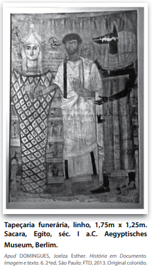 A figura mostra uma tapeçaria funerária produzida no Egito, durante o chamado Período Helenístico, retratatando um homem vestido como grego, posicionado entre dois deuses egípcios, Osíris e Anúbis.