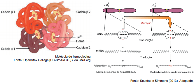 A hemoglobina do adulto humano é composta por quatro subunidades, sendo duas do tipo alfa, codificadas pelo gene HBA, no cromossomo 16, e duas do tipo beta, codificadas pelo gene HBB no cromossomo 11, compondo uma proteína quaternária. Observe as imagens a seguir: