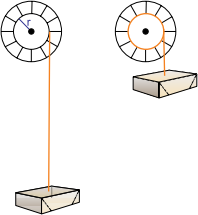 A imagem descreve o içamento de uma caixa por meio de uma corda fixada a ela e a uma roda circular de raio r = 30 cm.