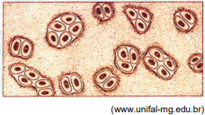 A imagem representa uma fotomicrografia de um tecido humano caracterizado por agrupamentos celulares separados por matriz extracelular que foi corado artificialmente para melhor visualização de seus componentes.