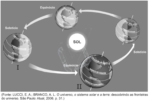 Observando a representação do movimento de translação e as estações do ano, na figura abaixo, identifique e relacione os desenhos I e II, respectivamente, às estações do ano, no Hemisfério Sul.