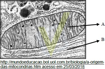 A micrografia eletrônica, abaixo, mostra duas organelas celulares, indicadas pelas letras A e B