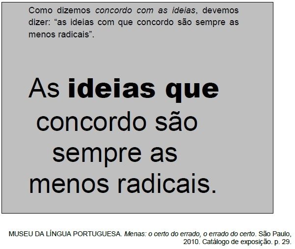 A ocorrência de frases como “As ideias que concordo são sempre as menos radicais” é comum na conversa espontânea de falantes do português brasileiro. Considerando as informações do quadro, assinale a alternativa em que o emprego do pronome relativo esteja adequado à modalidade escrita formal da língua portuguesa.