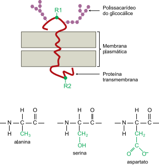 A proteína transmembrana de um macrófago apresenta aminoácidos constituídos pelos radicais polares R1 e R2, presentes em dois dos aminoácidos indicados pelas fórmulas estruturais presentes na figura.