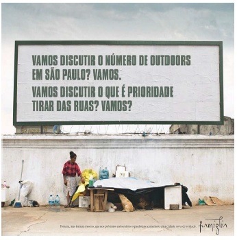 A publicidade acima foi divulgada no site da agência FAMIGLIA no dia 24 de janeiro de 2007, véspera do aniversário de São Paulo, no período em que foi proposta a campanha “Cidade Limpa”. Na base da foto, em letras bem pequenas, está escrito: Tomara, mas tomara mesmo, que nos próximos aniversários o paulistano comemore uma cidade nova de verdade.