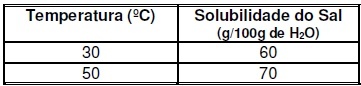 Para dissolver 40 g desse sal à 50oC e 30oC, as massas de água necessárias, respectivamente, são:
