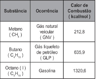 Ainda que outras fontes de energia já sejam realidade em várias regiões do mundo, os hidrocarbonetos continuam sendo uma importante forma de matriz energética, desde o aquecimento das casas até os automóveis e indústrias, a sociedade ainda se vê amarrada à utilização dessas substâncias. A tabela a seguir apresenta os calores de combustão de três hidrocarbonetos que são utilizados como combustíveis.