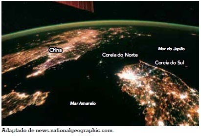 As imagens noturnas feitas por satélites revelam a distribuição espacial do consumo de energia elétrica, permitindo identificar diferenças importantes entre as sociedades humanas, como no exemplo abaixo.