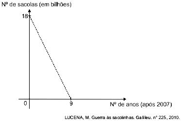 As sacolas plásticas sujam florestas, rios e oceanos e quase sempre acabam matando por asfixia peixes, baleias e outros animais aquáticos. No brasil, em 2007, foram consumidas 18 bilhões de sacolas plásticas. Os supermercados brasileiros se preparam para acabar com as sacolas plásticas até 2016. Observe o gráfico a seguir, em que se considera a origem como o ano de 2007.