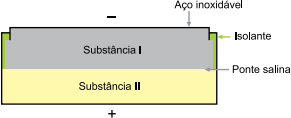 Considerando-se a pilha representada no esquema, a substância I, o potencial padrão teórico e os produtos da reação global são, respectivamente: