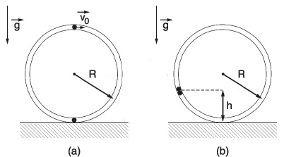 Duas esferas idênticas, de dimensões desprezíveis e de mesma massa, estão no interior de um tubo circular delgado de raio R = 0,30 m, fixado na posição vertical. No instante t = 0, a partícula posicionada na extremidade superior do tubo é impulsionada com uma velocidade V0 de módulo 2,00 m/s e horizontal. Ela segue em rota de colisão com a segunda partícula que está em repouso na extremidade inferior do tubo (figura a). Após uma colisão completamente inelástica, ambas as partículas sobem no tubo, até uma altura máxima h (figura b). Desprezando o atrito das partículas com o interior do tubo, a altura máxima h, em metros, é igual a