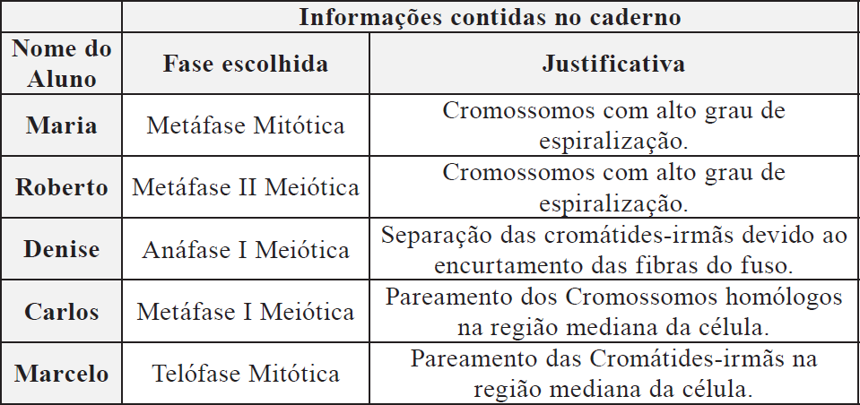 Em seguida, o professor pediu a seus alunos que escrevessem no caderno se a ilustração representava uma fase da meiose ou uma fase da mitose. Deveriam, também, identificar o nome da fase escolhida e justificar.