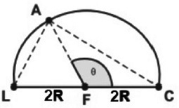 Durante seu treinamento, um atleta percorre metade de uma pista circular de raio 2R, conforme figura a seguir. A sua largada foi dada na posição representada pela letra L, a chegada está representada pela letra C e a letra A representa o atleta. O segmento LC é o diâmetro da circunferência e o centro da circunferência está representado pela letra F.