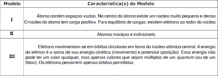 Em épocas distintas, os cientistas Dalton, Rutherford e Bohr propuseram, cada um, seus modelos atômicos. Algumas características desses modelos são apresentadas na tabela a seguir: