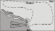 Em um bairro da grande Florianópolis foi realizada uma prova de mini maratona. Os organizadores pensaram em fazer uma prova semelhante a ao Ironman, porém, com dimensões reduzidas. O percurso da prova está mostrado no mapa e as medidas são: 800m do percurso da natação, 4000m do percurso do ciclismo e 1500m do percurso da corrida. A prova começou com 01 volta no percurso da natação, em seguida 05 voltas no percurso do ciclismo e, finalmente, 03 voltas no percurso da corrida. (L = largada e C = chegada).