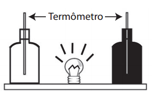 Em um experimento foram utilizadas duas garrafas PET, uma pintada de branco e a outra de preto, acopladas cada uma a um termômetro. No ponto médio da distância entre as garrafas, foi mantida acesa, durante alguns minutos, uma lâmpada incandescente. Em seguida a lâmpada foi desligada. Durante o experimento, foram monitoradas as temperaturas das garrafas: a) enquanto a lâmpada permaneceu acesa e b) após a lâmpada ser desligada e atingirem equilíbrio térmico com o ambiente.