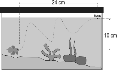 Maria, após colocar ração para o peixe Beta do irmão, fica observando seu movimento no aquário e percebe que ele leva 5s para sair de sua posição e chegar onde está a ração. Tentando lembrar-se de seus estudos, cria um esquema do aquário no instante em que o peixe começou seu movimento (figura ao lado), desenhando sua trajetória (linha tracejada que liga o peixe a ração), e faz algumas afirmações.