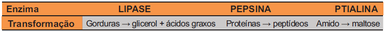 Na digestão humana, atuam as enzimas lipase, pepsina e ptialina , que aceleram as interações químicas que ocorrem em diversas partes do tubo digestório.