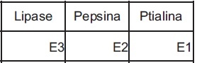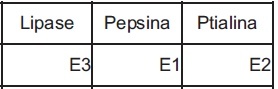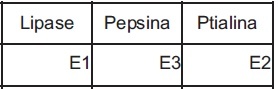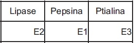 Sabendo que E1, E2 e E3 correspondem às enzimas lípase, pepsina e ptialina, não necessariamente nessa ordem, assinale a alternativa que identifica corretamente essas enzimas: