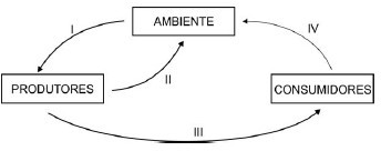 No esquema abaixo, as setas numeradas de I a IV indicam transferências de moléculas ou energia entre seres vivos e entre eles e o ambiente.