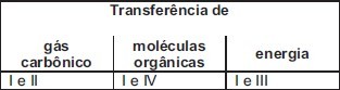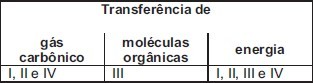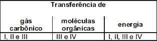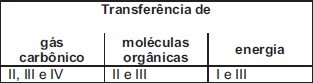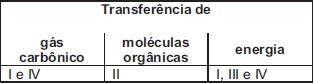 Assinale a alternativa do quadro abaixo que mostra, corretamente, as passagens em que há transferência de gás carbônico, de moléculas orgânicas ou de energia.