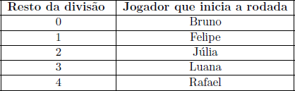 Um grupo de cinco amigos utiliza essa roleta para decidir quem inicia cada rodada de um jogo. A cada rodada, a roleta é acionada e o número escolhido é dividido por 5, tomando-se o resto dessa divisão. Então, o jogador que inicia a rodada é definido de acordo com a tabela abaixo.