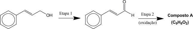 O cinamaldeído é um líquido amarelo oleoso com odor de canela presente no óleo essencial das árvores do gênero Cinnamomum. Este aldeído é utilizado como aromatizante de alimentos, bebidas, medicamentos e perfumes. Sinteticamente, o cinamaldeído pode ser obtido como ilustrado no esquema mostrado a seguir. Ele pode ser transformado quimicamente em outros compostos, entre os quais se encontra o composto (A), de fórmula molecular C9H8O2, obtido por oxidação do aldeído, que pode ser utilizado como matéria-prima na produção de filtros solares.