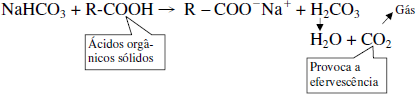 - é o principal componente do alka-seltzer, sonrisal, sal de frutas eno etc..., que contêm também ácidos orgânicos sólidos, como o ácido tartárico, o cítrico e outros (representados genericamente por R – COOH). Na presença da água ocorre a reação