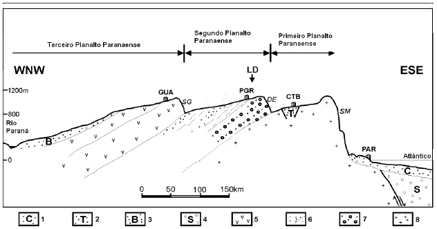 Legenda: PAR, CTB, PGR e GUA: cidades de Paranaguá, Curitiba, Ponta Grossa e Guarapuava; SM, DE e SG: Serra do Mar, Escarpa Devoniana e Serra Geral, respectivamente; LD: Lagoa Dourada. 1: Sedimentos Cenozoicos; 2: Sedimentos Terciários da Bacia de Curitiba; 3: Rocha Sedimentar Mesozoica do Grupo Bauru; 4: Rocha Sedimentar Mesozoica da Bacia de Santos; 5: Derrames de lavas Mesozoico; 6: Rocha Sedimentar Permo-Carbonífera da Bacia do Paraná; 7: Rocha Sedimentar Devoniana da Formação Furnas; 8: Embasamento Proterozoico.