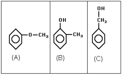 O quadro abaixo apresenta as fórmulas estruturais de três compostos orgânicos: (A) metoxi-benzeno; (B) o-metil fenol e (C) álcool benzílico.