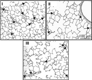 As imagens a seguir são fotomicrografias que representam, em mesma escala, os alvéolos pulmonares dos animais dos grupos estudados, mostrando o espaço aéreo alveolar; as setas representam o número de capilares alveolares.