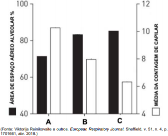 O gráfico abaixo mostra dados quantitativos referentes à área de espaço aéreo alveolar e à contagem de capilar.