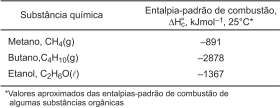 O valor da entalpia-padrão de combustão, é medido com uma bomba calorimétrica e serve para avaliar a quantidade de calor envolvida na combustão de substâncias orgânicas, a exemplo das apresentadas na tabela, utilizadas como fonte de energia. Um dos problemas ocasionados pelo uso dessas substâncias químicas, como combustível, é a produção do dióxido de carbono, CO2(g), um gás que contribui para o aumento do efeito estufa.