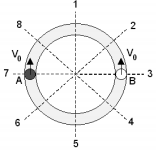 Em uma canaleta circular, plana e horizontal, podem deslizar duas pequenas bolas A e B, com massas MA = 3 MB, que são lançadas uma contra a outra, com igual velocidade V0, a partir das posições indicadas. Após o primeiro choque entre elas (em 1), que não é elástico, as duas passam a movimentar-se no sentido horário, sendo que a bola B mantém o módulo de sua velocidade V0.