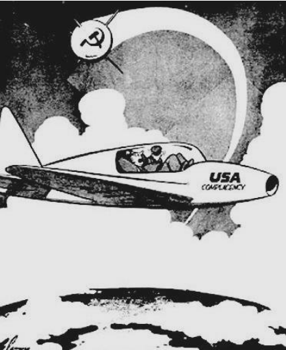 Na imagem, um avião chamado “A Complacência Americana” é ultrapassado por um objeto marcado com a foice e o martelo, assustando um dos passageiros.