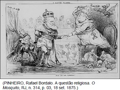 A charge acima representa o imperador D. Pedro II diante do Papa Pio IX, durante a chamada “Questão religiosa”. Sobre o assunto, é incorreto afirmar: