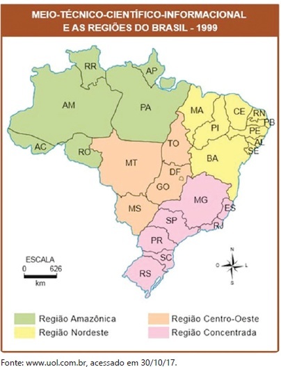 O cartograma refere-se à divisão regional formulada por Milton Santos e Maria Laura Silveira em 1999. Considerou-se para essa proposta: a quantidade de recursos tecnológicos avançados, o volume de atividades econômicas modernas em áreas financeiras e o papel da agropecuária em relação à mecanização e à integração com a indústria.