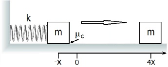 Considere a mola como sem massa e o coeficiente de atrito cinético entre o bloco e a superfície igual a μc .