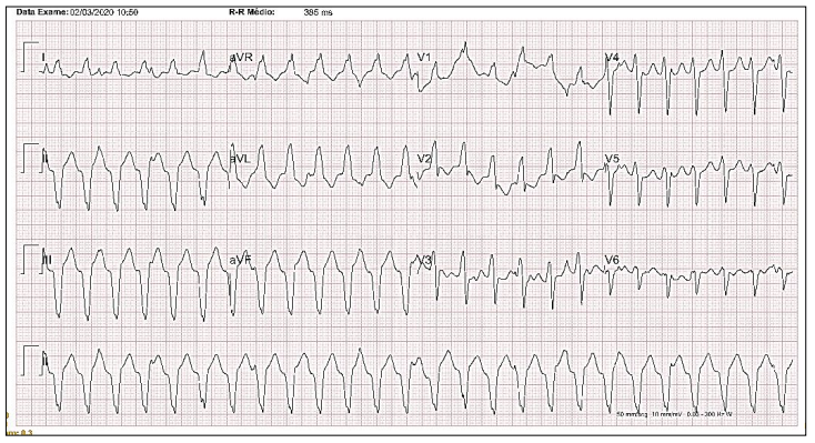 “Homem, 34 anos, portador de displasia arritmogênica do ventrículo direito, evolui há duas horas com episódio de palpitações, dispneia e pré-síncope. Deu entrada ao pronto-socorro, com sinais de hipoperfusão periférica e hipotensão (PAM: 55). Restante do exame físico sem alterações. Realizou o seguinte eletrocardiograma:”