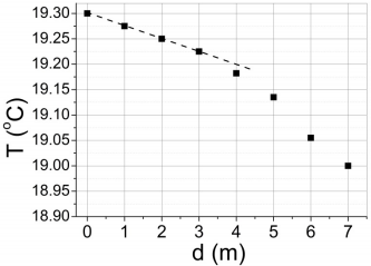Frequentemente esses drones são usados para medir a temperatura da água (T) em função da profundidade (d), a partir da superfície (d = 0), como no caso ilustrado no gráfico a seguir (dados adaptados).