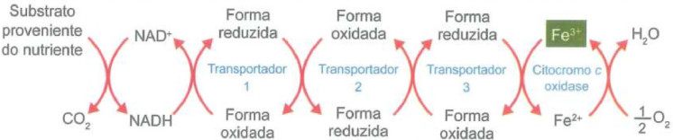 A produção de ATP depende do gradiente de prótons gerado pela cadeia respiratória. Nessas reações, os elétrons provenientes da oxidação do NADH em NAD+ percorrem a cadeia até chegarem a citocromo c oxidase reduzindo o \( Fe^{3+} \) a \( Fe^{2+} \). O oxigênio atua como aceptor final desses elétrons formando água. O cianeto é uma espécie química altamente tóxica que tem grande afinidade pelo \( Fe^{3+} \). Quando células são expostas ao cianeto, ele se liga ao sítio de \( Fe^{3+} \) da citocromo c oxidase, impedindo a sua conversão em \( Fe^{2+} \) e bloqueando a cadeia respiratória.