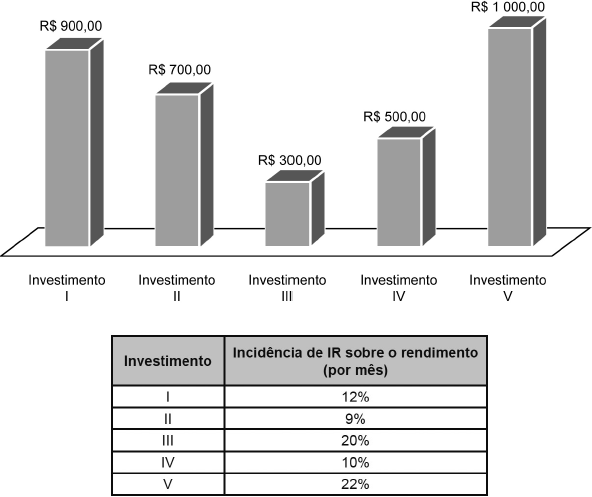 Um investidor pretende aplicar R$ 100 000,00 no mercado financeiro. Para isso pesquisou cinco investimentos distintos, aferindo os rendimentos mensais, em real, de cada um deles. Para decidir em qual aplicar seu dinheiro, considerou também a incidência mensal de Imposto de Renda (IR) sobre o respectivo rendimento. Avaliou que o maior retorno financeiro virá da aplicação em um único investimento: aquele em que a diferença entre o rendimento mensal e o imposto que incidir sobre ele seja a maior possível. Os dados levantados pelo investidor sobre rendimento e imposto referentes à aplicação encontram-se a seguir.