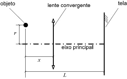 Um objeto puntiforme encontra-se a uma distância L de sua imagem, localizada em uma tela, como mostra a figura acima. Faz-se o objeto executar um movimento circular uniforme de raio r (r<<L) com centro no eixo principal e em um plano paralelo à lente. A distância focal da lente é 3L/16 e a distância entre o objeto e a lente é x. A razão entre as velocidades escalares das imagens para os possíveis valores de x para os quais se forma uma imagem na posição da tela é: