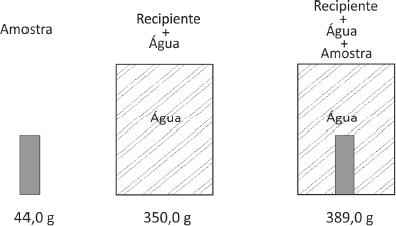 Uma amostra sólida, sem cavidades ou poros, poderia ser constituída por um dos seguintes materiais metálicos: alumínio, bronze, chumbo, ferro ou titânio. Para identificá‐la, utilizou‐se uma balança, um recipiente de volume constante e água. Efetuaram‐se as seguintes operações: 1) pesou‐se a amostra; 2) pesou‐se o recipiente completamente cheio de água;3) colocou‐se a amostra no recipiente vazio, completando seu volume com água e determinou‐se a massa desse conjunto. Os resultados obtidos foram os seguintes: