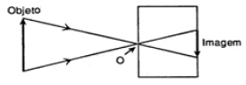 Uma câmera fotográfica caseira pode ser construída a partir de uma caixa escura, com um minúsculo orifício (O, na figura) em um dos lados, e uma folha de papel fotográfico no lado interno oposto ao orifício. A imagem de um objeto é formada, segundo o diagrama abaixo.